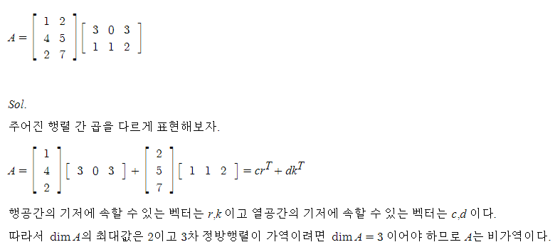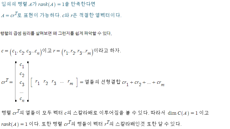행렬의 열들이 모두 c의 상수배임은 곧 행렬의 열공간이 벡터 c만을 사용하여 생성되는 부분공간이라는 것이고, 마찬가지 원리로 행공간은 벡터 r^T 만을 사용되어 생성된다. 즉 cr^T = A라고 두었을 때 C(A) = span{c}, C(A^T) = span{r^T} 이다.