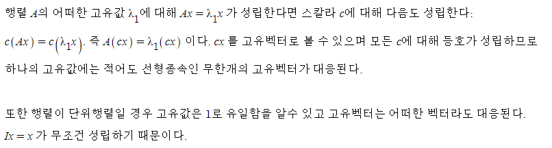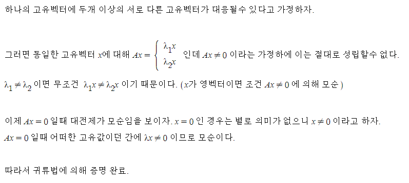 그렇기 때문에 고유값과 고유벡터간의 관계를 설명하려면 다음 문장이 적절할 것 같다.(뇌피셜임) "영벡터가 아닌 하나의 고유벡터에는 반드시 하나의 고유값만 대응되며 그 역은 성립하지 않는다." 이에 대한 증명은 다음과 같다.