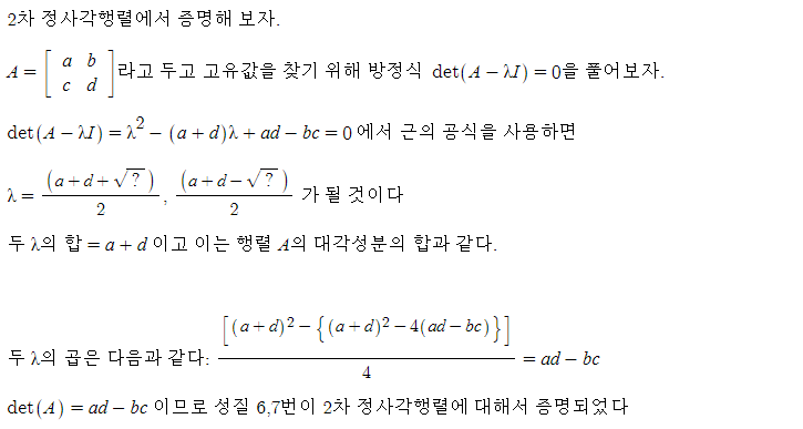 6. 행렬 A의 주대각성분을 모두 더한 합(이를 대각합이라고 부르며 trace 라고도 한다.)은 고유값의 합이다.