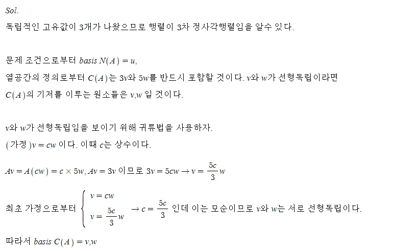 (6.1절 연습문제 19번)정사각행렬 A에 대해 Au=0, Av=3v, Aw=5w 가 성립할 때 다음 질문에 답하여라. 0,3,5는 고유값이며 각 벡터들은 영벡터가 아니다.