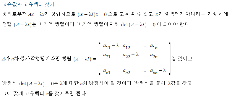 A를 정사각행렬에 대해 한정하는 이유는 만약 A가 정사각행렬이 아니라면 주어진 연립방정식의 해가 없거나 무한할 것이기 때문에 별 의미가 없기 때문이다. 여하튼 정의로부터 어떤 행렬에 대해 고유벡터를 찾고 고유값 또한 찾아낼 수 있다. 과정은 다음과 같다: