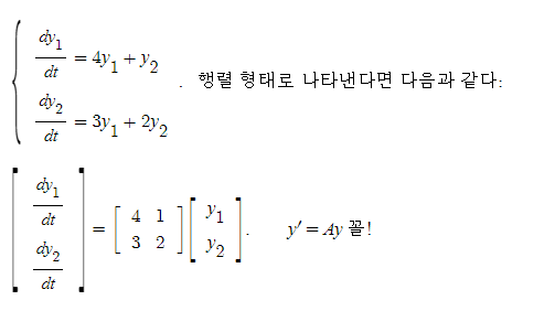 바로 위에서 연립 미분방정식을 행렬 형태로 바꾸고 풀어내는 과정을 확인했다. 이제는 각 행렬에 대해 고유값과 고유벡터를 어떻게 찾는지, 또 이 방법으로 찾은 벡터와 고유값이 왜 미분방정식을 올바르게 푸는지에 대해 설명할 것이다.