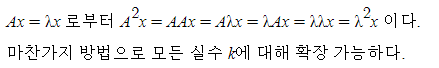 4. A에 대한 다항방정식에 대해서도 고유값을 찾을수 있다. 예를들어 A^2+3A+5I 의 고유값은 lambda^2+3lambda+5 이다.