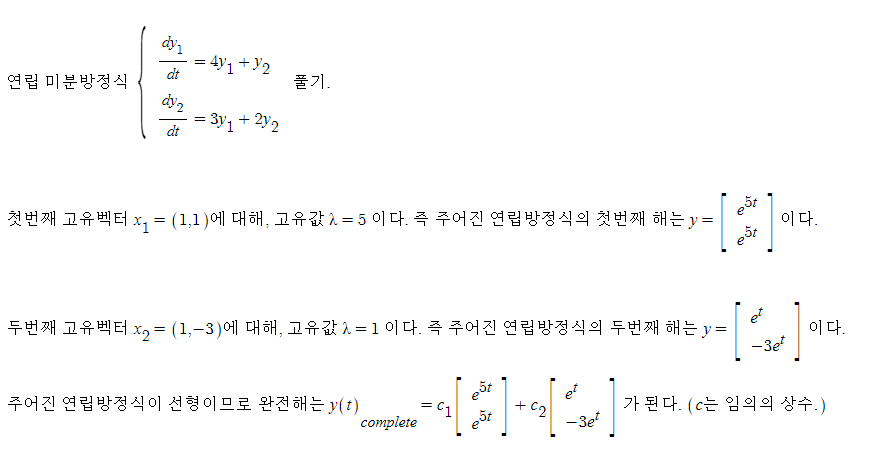 그렇다면 두 개의 해 y_1과 y_2 는 각각 ae^ct, be^ct 꼴로 나타날 것이고, 여기서 벡터 x=(a,b)를 계수 행렬 A의 고유벡터(eigenvector), 상수 c값을 행렬 A의 고유값(eigenvalue)이 된다.(참고로 고유값은 그리스 문자 람다로 많이 표시한다.) 이를 기반으로 주어진 연립 미분방정식을 풀어보면 다음과 같다: