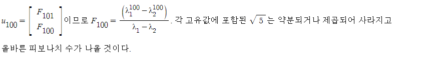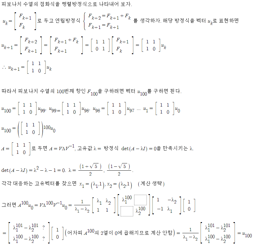이제 행렬의 거듭제곱을 사용하는 예시로서 피보나치 수열의 각 항들을 구하는 방법에 대해 공부한다. 피보나치 수열은 첫째항과 둘째항이 0,1 이며 세번째 항부터는 앞선 두 항을 더한 값으로 정의되는 수열이다. 점화식으로 나타내면 다음과 같다: