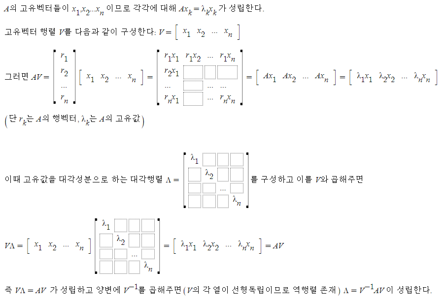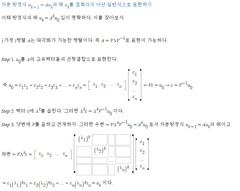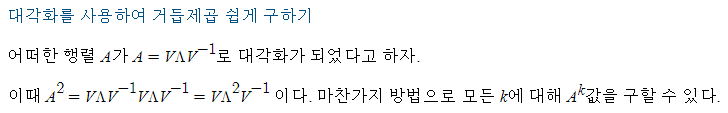 여기서 참고할 점은, 대각화된 행렬 A를 거듭제곱할때 고유벡터가 유지된다는 점이다. A^2=V(Λ^2)V^-1 인데, 이는 거듭제곱 A^2의 대각화로 볼 수 있으며, 고유벡터 행렬 V는 그대로 유지됨을 알 수 있다. 즉 대각화가 가능하다면 거듭제곱 뿐만 아니라 고유벡터, 고유값까지 쉽게 알아낼 수 있는 것이다.(Λ가 대각행렬이므로 거듭제곱은 매우 쉽다.)