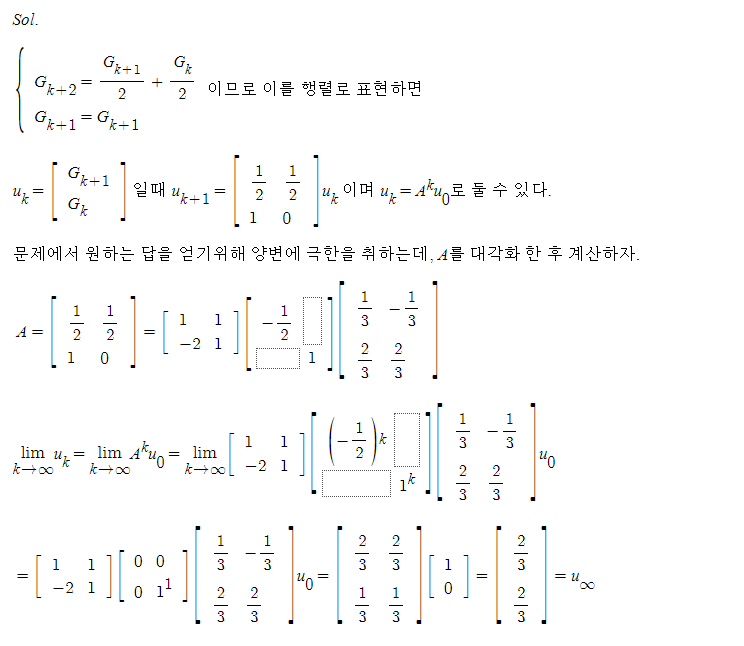 (6.2절 연습문제 9번)기보나치 수열은 첫째항과 둘째항이 각각 0과 1이고 3번째항 부터는 이전 두 항의 평균으로 정의된다. 즉 G_k+2 = G_k+1 + G_k 이다. 이때 기보나치 수가 2/3에 가까워짐을 보여라.