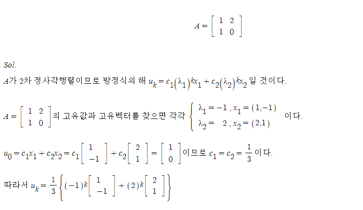 (6.2절 예제 3번) u_0=(1,0) 부터 시작하는 차분방정식 u_k+1 = Au_k 의 해를 일반식으로 표현하라. A는 다음과 같이 주어진다: