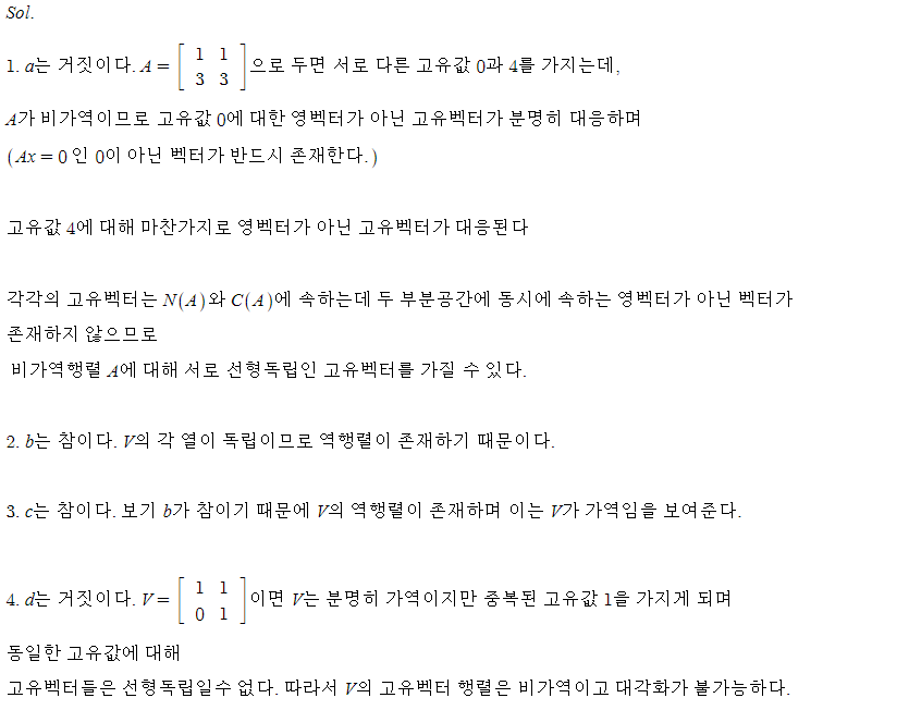 (6.2절 연습문제 4번)A의 고유벡터 행렬 V의 열들이 선형독립일때 참/거짓을 판단하라.