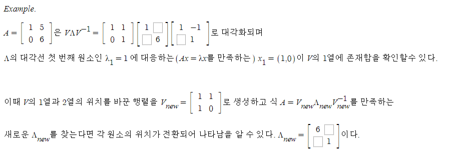 여기서 하나 짚고 넘어갈 것이 있다. 행렬 A를 대각화시키면 A=VΛV^-1 형태로 나타나게 되는데, 이때 고유벡터 행렬 V 내부의 열벡터들과 고유값 행렬 Λ을 구성하는 원소들(A의 고유값들)의 배치 순서가 서로 같게 나타난다. (Ax = lambda x 를 만족하는 벡터와 값들이 서로 같은 위치에 있다. 예를 들어 두번째 고유값에 대응하는 고유벡터는 V의 2열에 위치한다.) 이때, 식 A=VΛV^-1 에서 V의 열들의 위치를 바꾼다면 , 고유값 행렬 Λ 또한 그에 맞추어 원소들의 위치가 바뀌게 된다. 예시를 가지고 보면