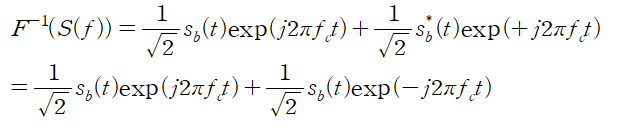 결론적으로 baseband equivalent signal s_b(t)에서 passband signal s(t)는 다음 공식을 사용하여 얻을 수 있다: