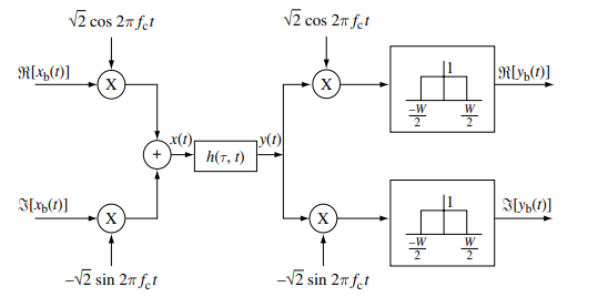 baseband signal x_b(t)가 up-convert되어 시스템의 입력으로 동작하고, 시스템의 출력 y(t)가 down-convert되어 baseband equivalent model로 변한다.
