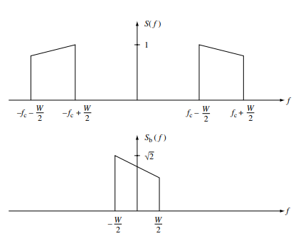 등가인 두 신호에 대해 signal energy가 같아야 하기 때문에 baseband의 푸리에변환 S_b(f)에 계수 sqrt2를 곱해준다.