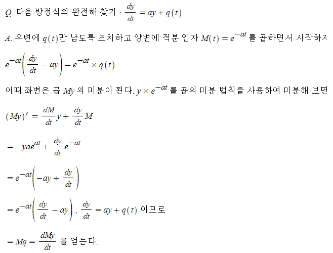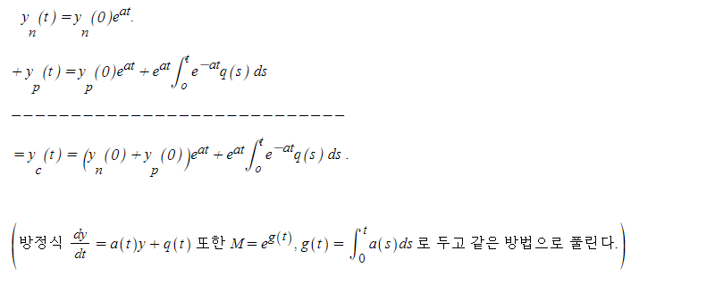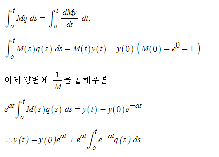 그렇다면 이제 직접 방정식을 풀어보자. 책에 나와있는 방법인 적분 인자 M(t) 를 사용하는 방법에 대해 알아보자.