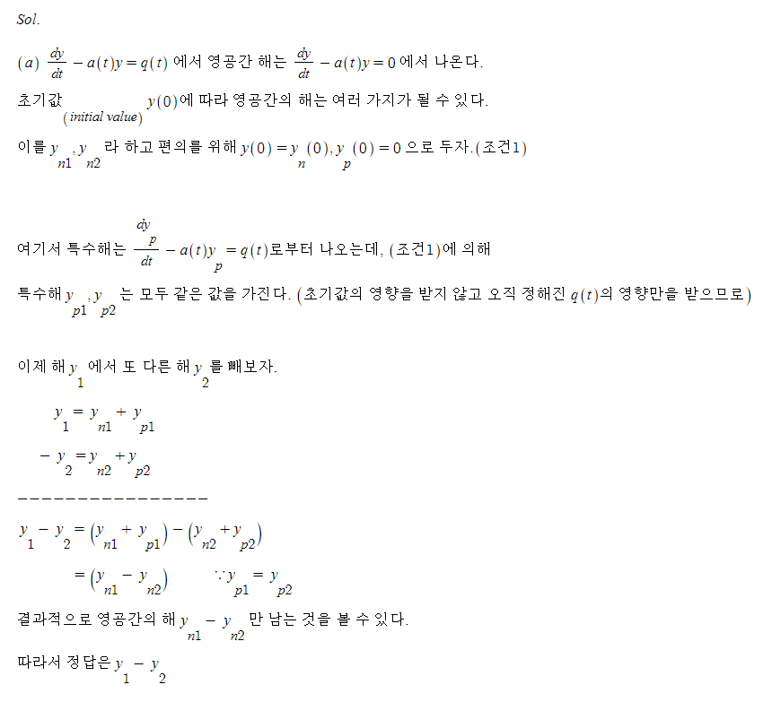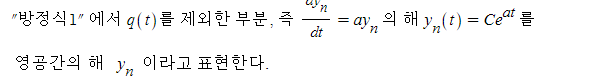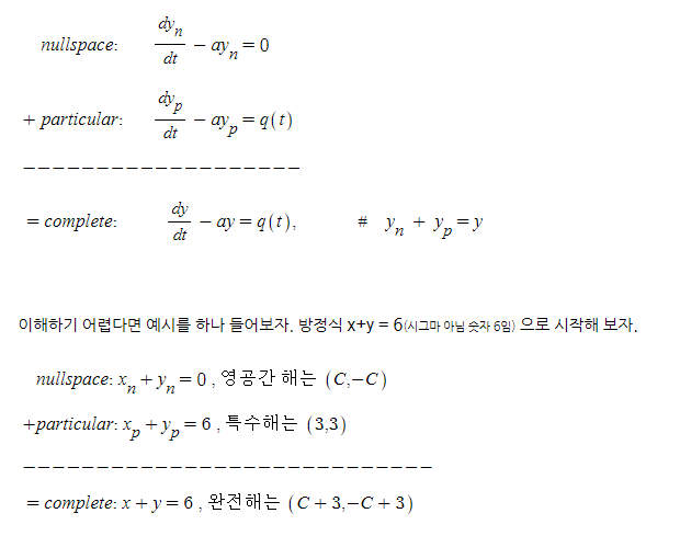 이런 형태의 방정식을 풀 때 중요한 것은 해 y(t) 를 두 부분으로 나누어 볼 수 있어야 하는 것이다. 하나는 초기값 y(0) 으로부터, 나머지 하나는 q(t) 에서 나온다. 순서대로 영공간해(nullspace solution), 특수해(particular solution)이라고 부른다.
