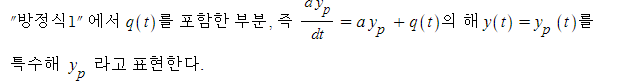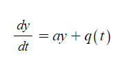 여기서 방정식의 우변에 새로운 인자 q(t) 를 추가해보자. 그러면 y의 도함수(혹은 변화율) dy/dt 는 q(t) 의 영향을 추가로 받게 된다.