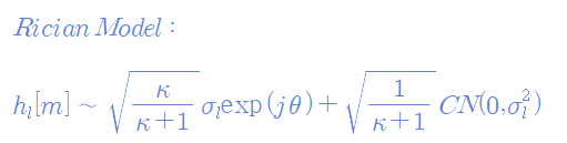 specular path란 receiver가 수신받는 여러 경로의 임펄스 응답 중 반사, 분산 등의 영향을 비교적 받지 않아 나머지 경로의 임펄스 응답에 비교하여 매우 강한 strength를 가지는, 즉 전체 임펄스응답 h[m]에서 dominant하게 작용하는 응답을 의미한다. 두번째 항은 specular path에 비해 신호의 strength가 많이 감소하고 반사, 분산 등으로 인해 위에서 공부한 Rayleigh model을 따르는 임펄스 응답의 합이다.