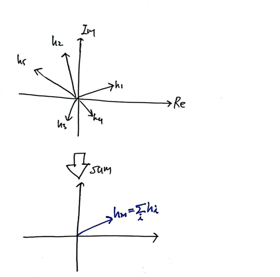 각 경로의 임펄스 응답 h_i에 대해 실수부와 허수부가 독립이라고 가정하고, 임펄스 응답이 도달하는 경로 i의 개수가 충분히 많기 때문에 최종 응답 h[m]의 실수부와 허수부는 central limit theorem에 따라 평균이 0이고 동일한 variance를 가지는 정규분포를 따르게 된다.