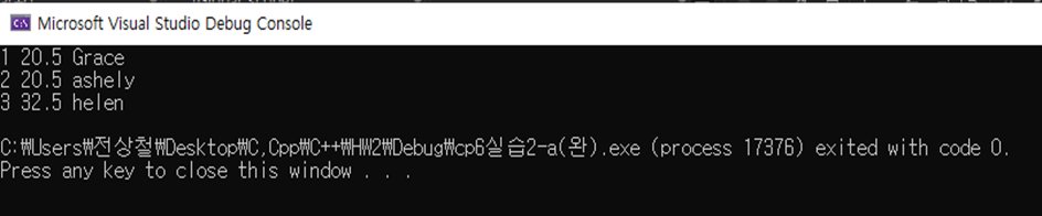 | #include<iostream> using namespace std; class Person { int id; double weight; string name; public: void show() { cout << id << ' ' << weight << ' ' << name << endl; } Person(int id = 1, string name = "Grace", double weight = 20.5); //id, name, weight를 패러미터로 받는 생성자 }; Person::Person(int id, string name, double weight) { this->id = id; this->name = name; this->weight = weight; } int main() { Person grace, ashely(2, "ashely"), helen(3, "helen", 32.5); grace.show(); ashely.show(); helen.show(); } |