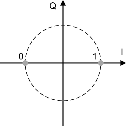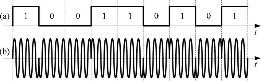 는 동일 주파수(carrier frequency)와 진폭을 가지며 서로 다른 phase를 가지게 된다. 여기서 첫 번째 파형을 0에 대응시키고 두 번째 파형을 1에 대응시킨다면 이진 신호 0과 1을 주고받을수 있는 것이다. 예를들어 신호 "100110101"에 대응하는 시간 영역 파형은 다음과 같다: