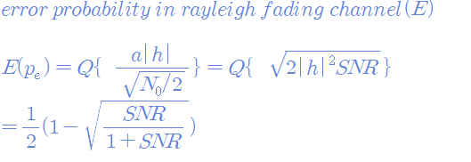 하지만 표현식에서 |h|가 random variable이기 때문에 깔끔하게 상수로 나오지 않는다. 따라서 양변에 Expectation을 취해주면 아래와 같이 Rayleigh fading channel에서의 에러 발생 확률을 알 수 있다.
