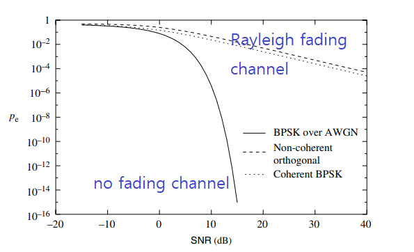 fading 없이 Gaussian noise만 관여하는 channel과 fading이 존재하는 두 채널의 error probabilty를 로그스케일 SNR에 대한 그래프로 나타내면 다음과 같다.