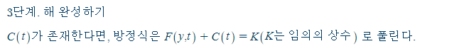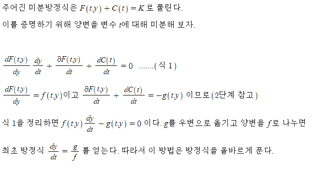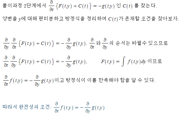 만약 C(t) 가 존재한다면, 방정식이 완전하다고 말하고, 최초 방정식 f(y,t)dy = g(y,t)dt 이 풀린다.