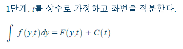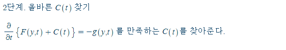 그렇다면 어떠한 미분방정식이 C(t)를 가질까? (=완전 미분방정식의 조건이 무엇일까?)2단계가 가능하여 C(t)가 존재하는 방정식은 어떠한 조건을 가지는지 공부한다.