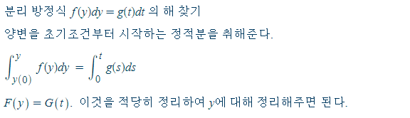 방정식 f(y)dy = g(t)dt 를 살펴보면 좌변에는 오직 y 에 대한 함수들이, 우변에는 t에 대한 함수들이 있는 것을 알 수 있다. 이를 변수분리형 미분방정식, 줄여서 분리 방정식이라고 부른다.