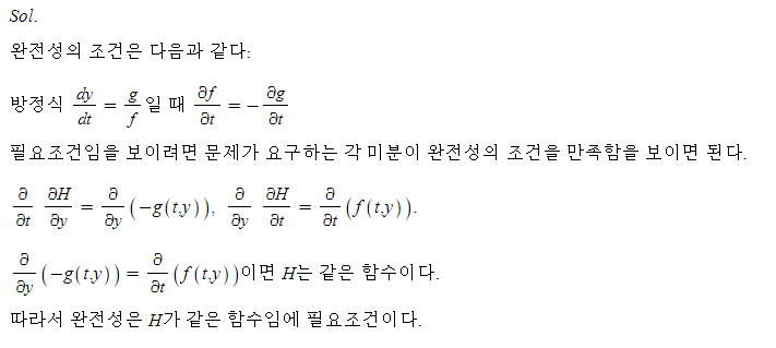 (1.8절 연습문제 16번) 완전성은 같은 함수 H(t,y)에 대한 다음 두 방정식을 푸는 조건이 된다.